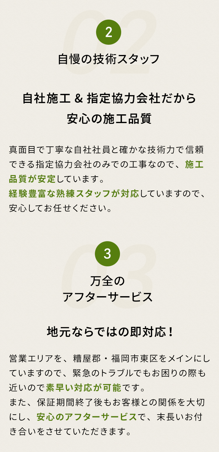 お客様へよりスピーディな対応を行うため、粕屋郡[志免町,粕屋町,宇美町,篠栗町,新宮町,須恵町,久山町]福岡市全域を中心に仕事をしています。